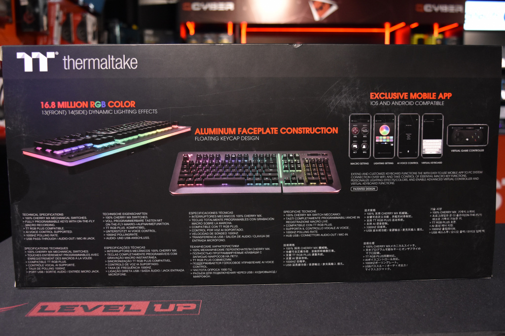 Как и предшественница, новая клавиатура упакована в стандартную картонную коробку, на передней части которой изображена клавиатура крупным планом, а на задней части производитель перечислил основные преимущества модели. Здесь, в частности, отмечены переключатели Cherry MX, RGB-подсветка, возможность записи макросов, USB-порт и аудиоразъем, мобильное приложение, а также синхронизация подсветки с устройствами Thermaltake и Razer (об этом чуть позже).