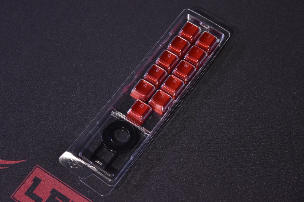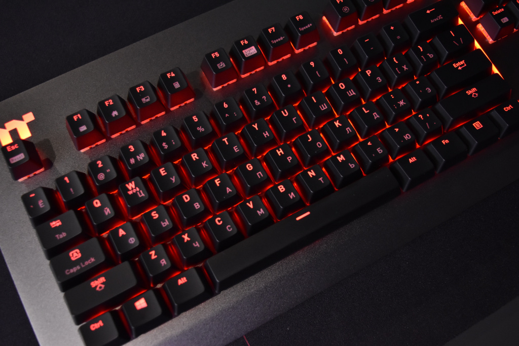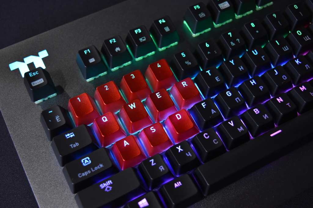 Количество одновременных нажатий – без ограничений, но этим сейчас мало кого удивишь, также, как и тем, что клавиши клавиатуры имеют ресурс в 50 миллионов нажатий. Этого должно хватить на всю жизнь, ну или пока клавиатура не сломается (в чем мы очень сомневаемся). Отдельно стоит рассказать про комплект сменных кейкапов, поставляемых в комплекте с клавиатурой. Всего их 11, и они нужны, чтобы заменить самые часто нажимаемые клавиши по мнению Thermaltake, а именно цифры 1-4, клавиши WASD, а также Q, E и R. Колпачки выполнены из аналогичного основным клавишам АБС-пластика, но красного цвета и с более гладкой поверхностью.