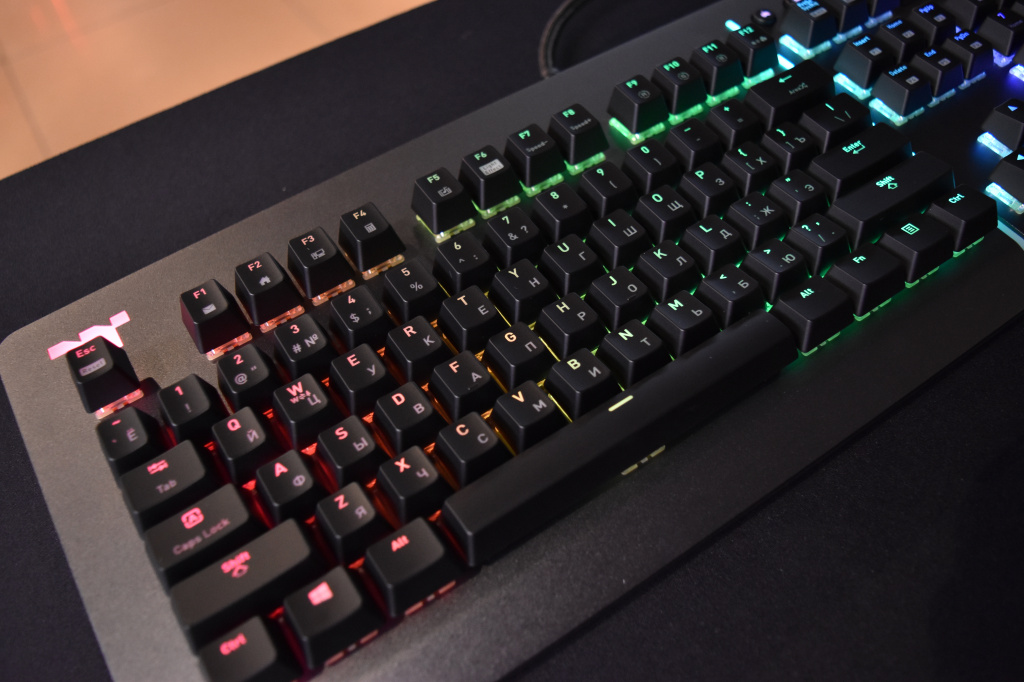 На них нанесены буквы английской раскладки, а вот при локализации для российского рынка на кейкапы русскую раскладку не нанесли. Такое уже было у клавиатуры X1 RGB, и мы отмечали это как один из недостатков сменных колпачков. Дело в том, что не все игроки умеют писать вслепую и не все наизусть знают или запомнили, какие буквы русской раскладки на каких клавишах находятся. Во время динамичного матча, это конечно же, не сильно заметно, но вот когда нужно что-то написать в чат, у некоторых игроков могут возникнуть проблемы, поэтому данный момент обязательно стоит учесть как перед установкой сменного комплекта кейкапов, так и перед покупкой клавиатуры.