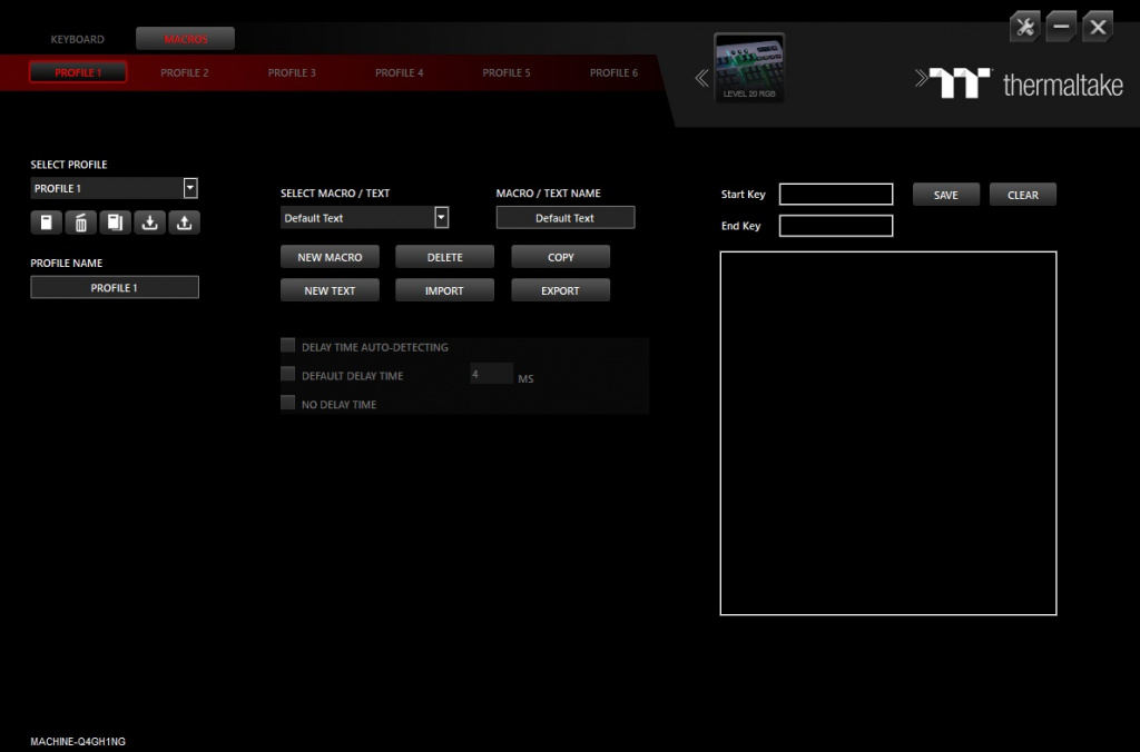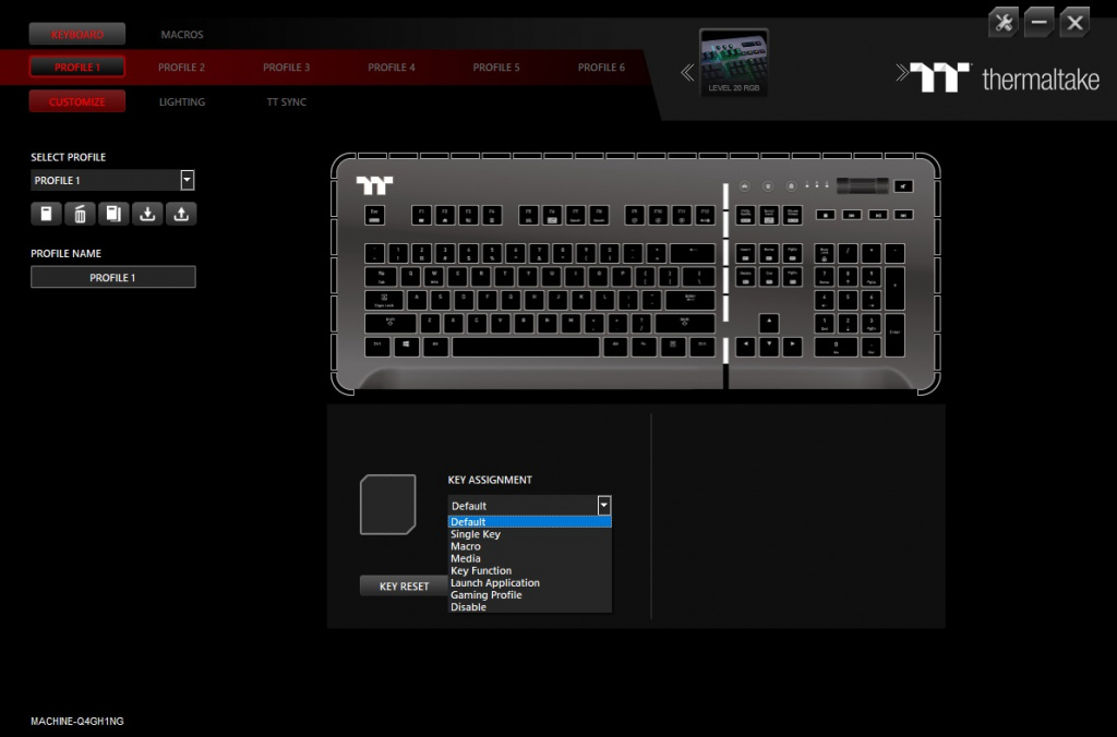 Для настройки клавиатуры Level 20 RGB используется фирменный софт TT iTake Engine, который позволяет тонко настраивать RGB-подсветку клавиатуры, переключаться между профилями и назначать макросы. В целом, набор стандартный. Макросы, к примеру, имеют полноценный редактор. Разумеется, есть несколько профилей, куда вы можете «забить» нужные настройки подсветки, синхронизации с другими устройствами и макросы. Всего профилей 6 и все сохраняются в память клавиатуры, чтобы Вы смогли переключаться между ними даже если, к примеру, взяли клавиатуру на LAN-турнир.