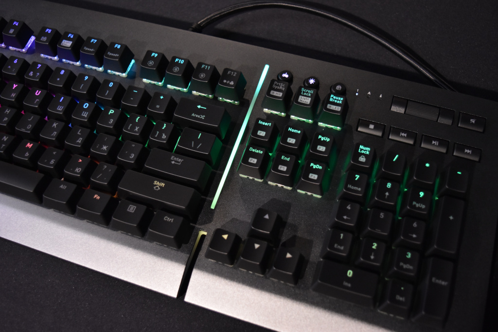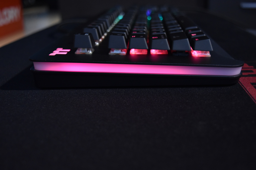 Большое дополнение к RGB-пиршеству – светодиодная полоса, расположившаяся между блоком с символьными клавишами и блоком с курсорными клавишами, о которой мы уже упоминали, но самое главное в TT Level 20 RGB – это прозрачная широкая световая панель по всему периметру корпуса клавиатуры. Благодаря ей RGB-подсветка выглядит шикарно. Других, более корректных и цензурных слов для описания подсветки в данной клавиатуре навряд ли можно подобрать. Разумеется, световая панель синхронизируется с общей подсветкой клавитуры, но благодаря фирменному софту, её свечение можно настроить отдельно.